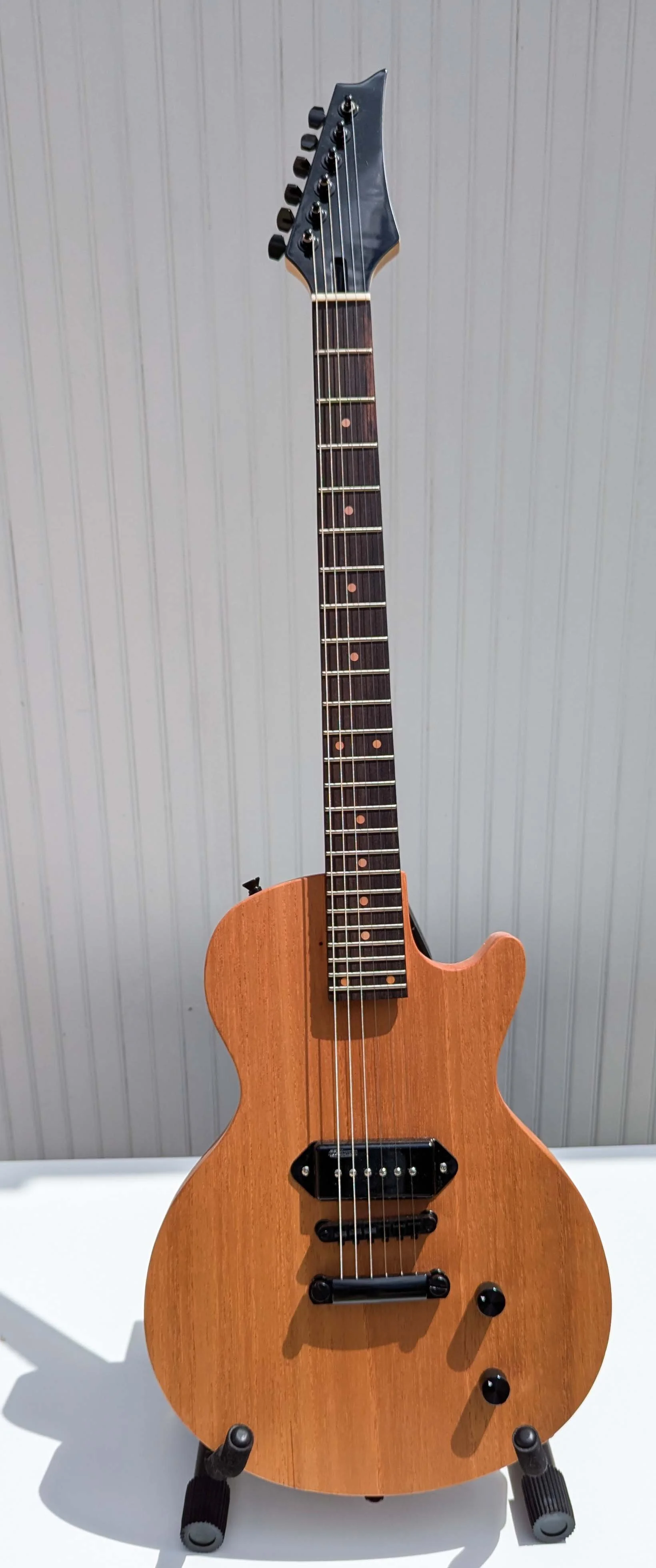 Inspired by the iconic Les Paul Junior, this double cut guitar body is made from ultralight Spanish Cedar, with an Ibanez style neck, which is super comfortable to play and pairs nicely with the body shape. It has a great, classic sound and with the lightweight body is easy and fun to play.